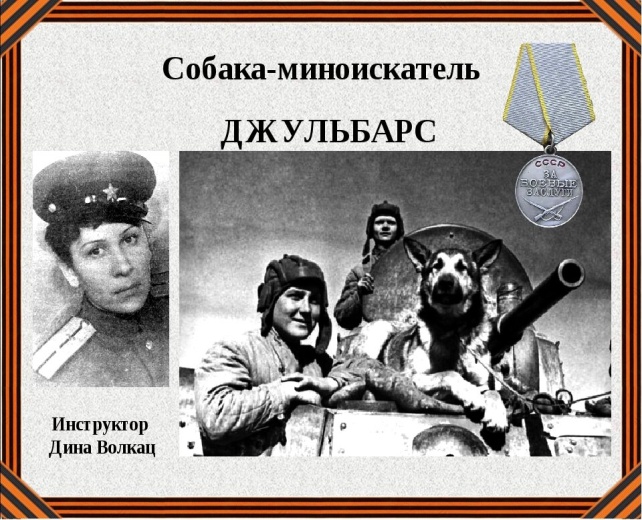 Пес Джульбарс (порода немецкая овчарка) – единственная собака, награждённая медалью «За боевые заслуги». Благодаря его отличному чутью было разминировано 7468 мин и более 150 снарядов на территории Чехословакии, Австрии, Румынии и Венгрии ( с сентября 1944г по август 1945 года). Он так же участвовал в разминировании дворцов над Дунаем, соборов Вены и замков Праги. Джульбарс принял участие в параде на Красной площади 1945 года.