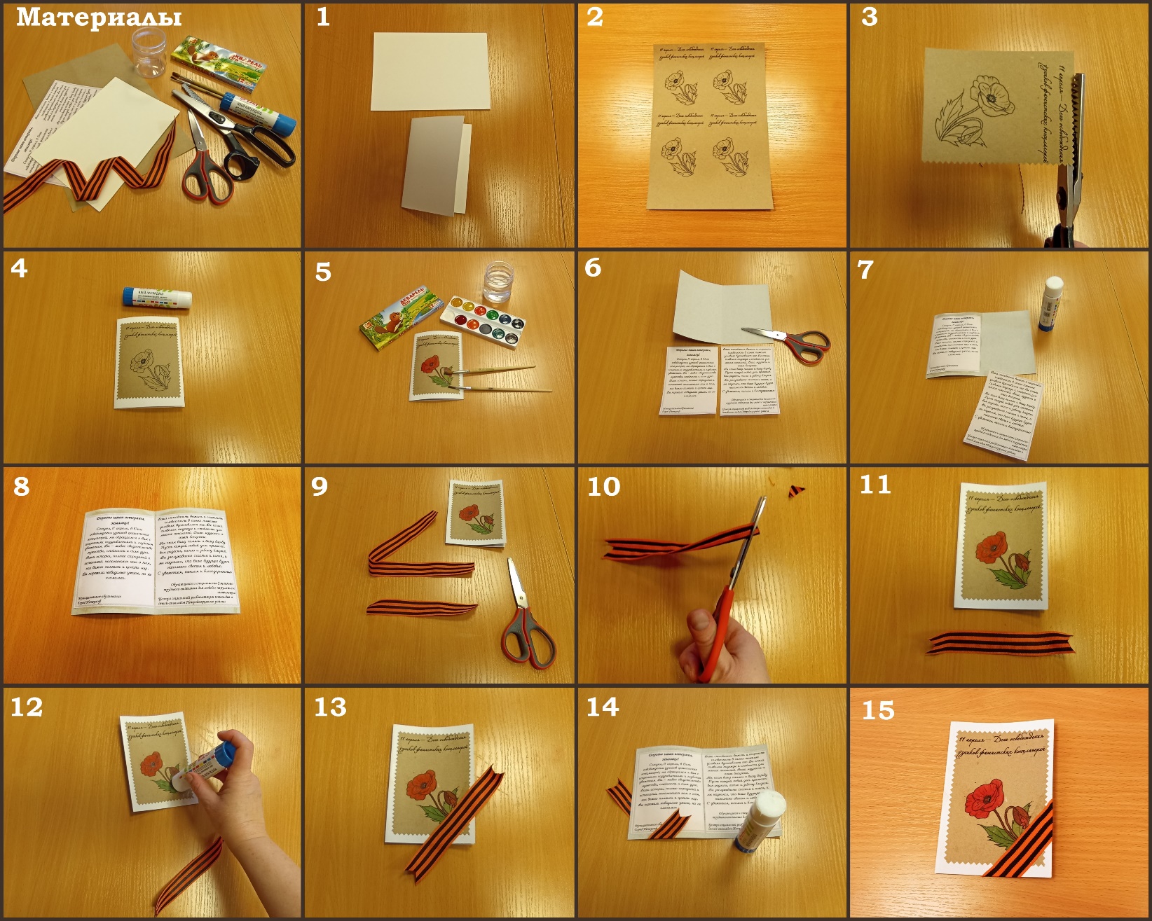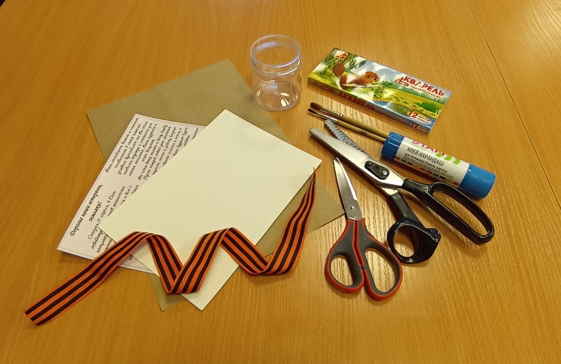 Для учителя: Компьютер (ноутбук) с выходом в сеть Интернет, схемы пошагового выполнения работы, крафт-бумага, плотный картон (белый), акварельные краски, кисть для краски, баночка для воды, клей-карандаш, ножницы, фигурные ножницы, шаблон с надписью «11 апреля – День освобождения узников фашистских концлагерей» и рисунком мака, георгиевская лента, поздравительный текст.