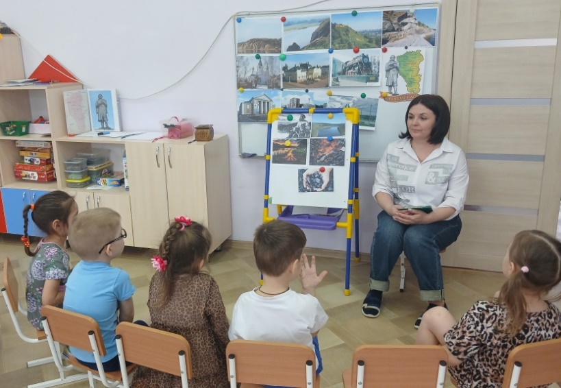 (Дети сидят полукругом. На мольберте: фотографии знакомых мест города.)