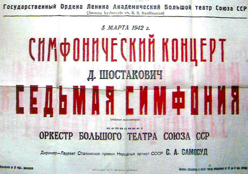 27 декабря 1941 года Шостакович окончил работу над симфонией, которую назвал Ленинградской, посвятив её страданию и великой борьбе горожан и защитников Родины. 5 марта 1942 года на сцене Куйбышевского театра оперы и балета состоялось поистине историческое событие – мировая премьера Седьмой (Ленинградской) симфонии. Оркестр Большого театра под управлением Самуила Самосуда исполнил произведение в присутствии автора, представителей других государств и, конечно, многочисленных советских слушателей. Трансляция велась по всем радиостанциям страны. Это событие можно назвать вершиной музыкальной жизни города в XX веке.