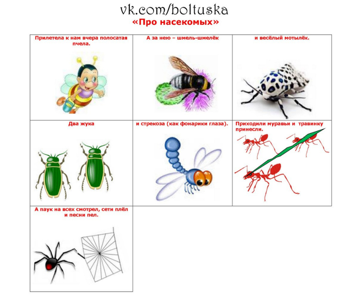 Дети: стрекоза, бабочка, пчела, оса, комар, муха, шмель, божья коровка.