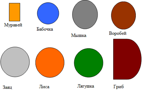слов-предметов: гриб, дождь, солнце, муравей, бабочка, мышь, воробей, заяц, лиса, лягушка;