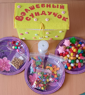 . «Волшебный сундучок» с предметами в ячейках «предлагает» детям найти собственный способ деятельности, например, собрать бусы, сортировка помпонов и т.д. (возможны любые варианты).