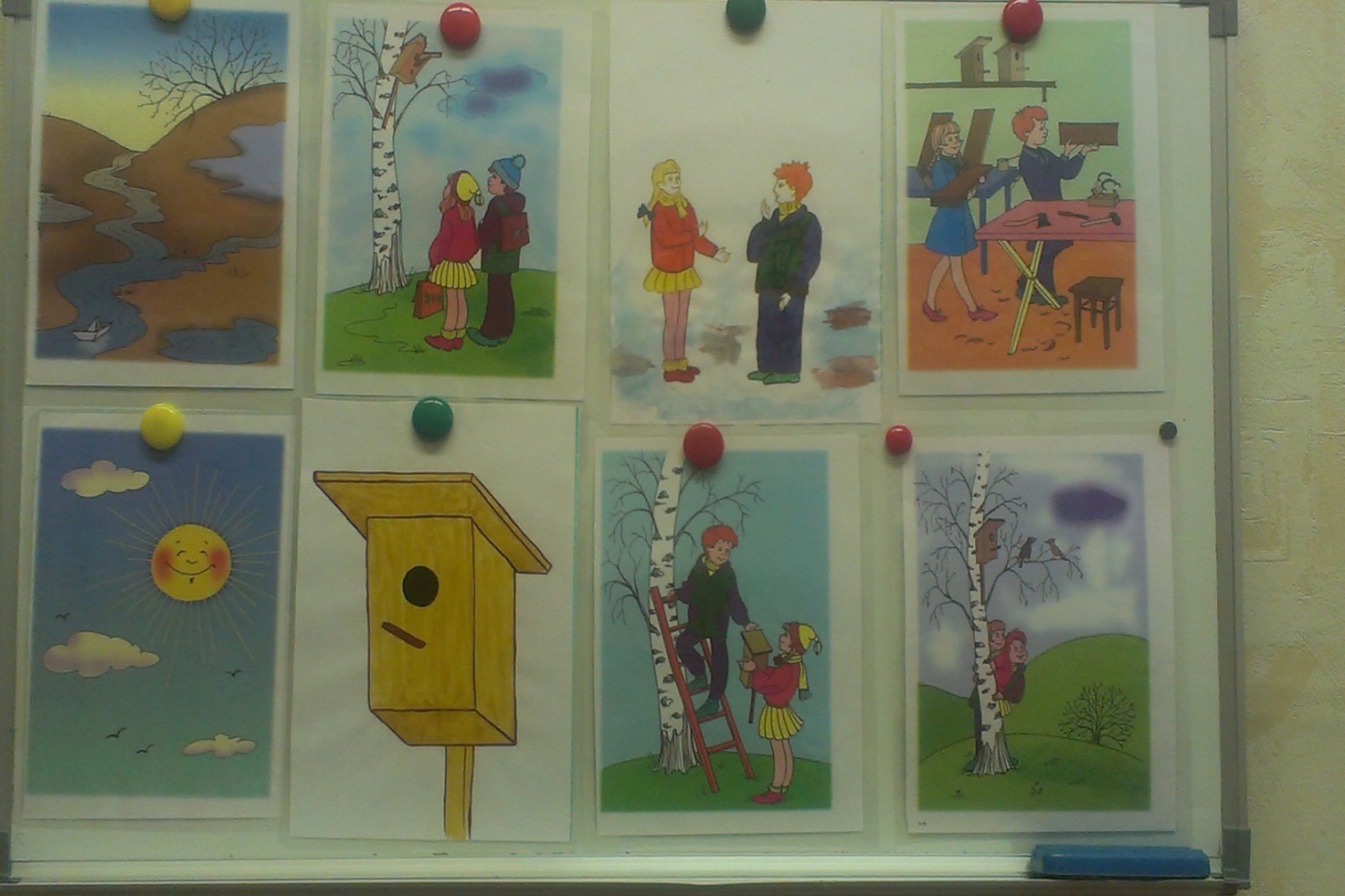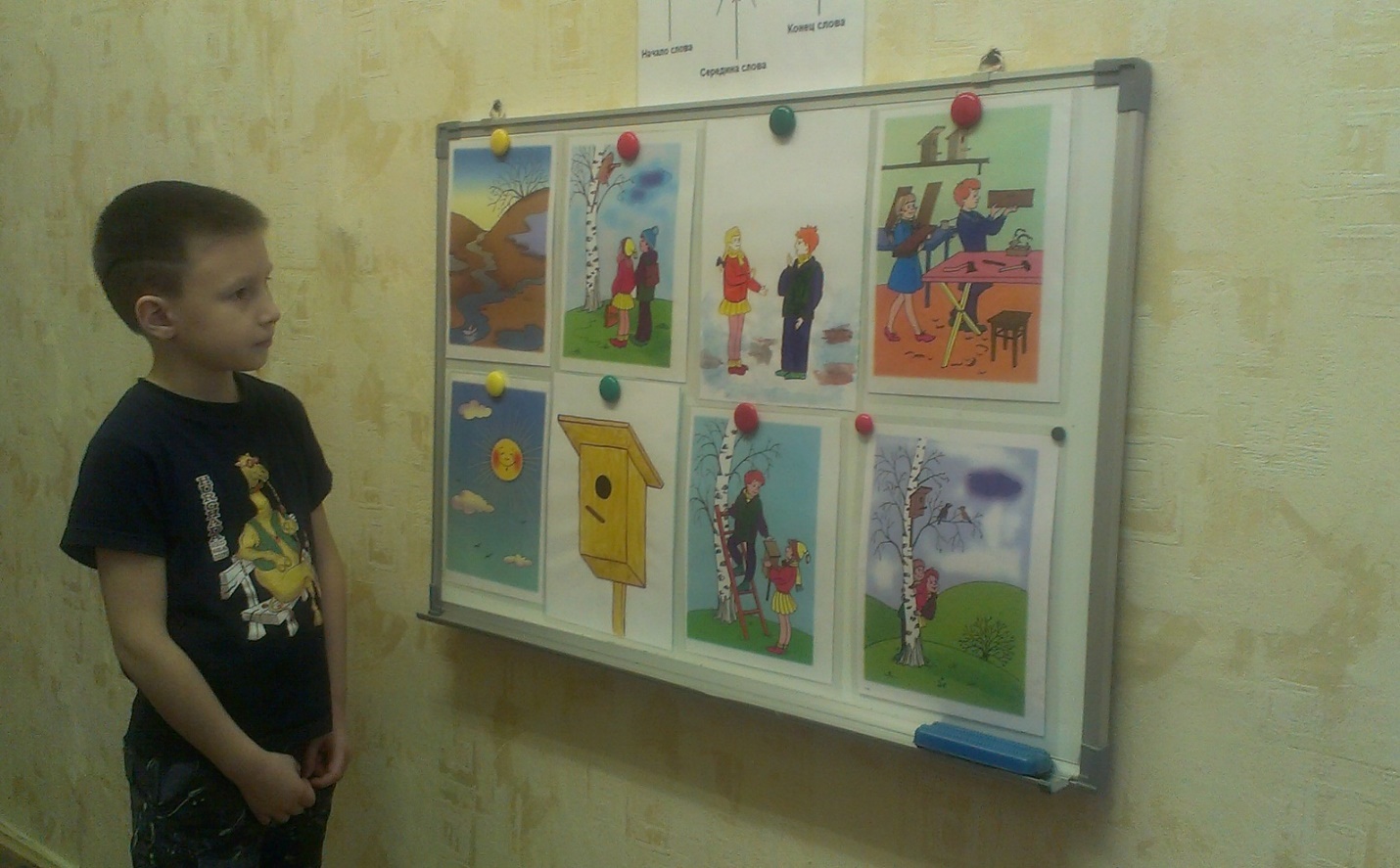 Логопед: на занятии вы будете учиться составлять рассказ «Прилет скворцов». (Рассматривание сюжетных картинок и размещение их на доске в логической последовательности).