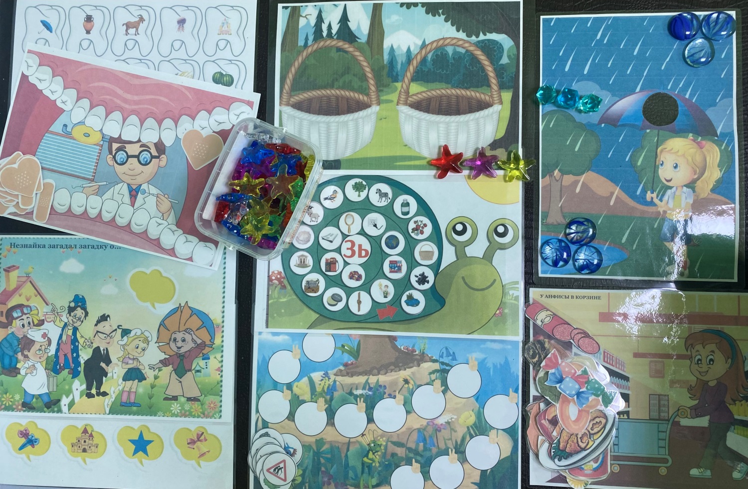 Игры: «Лечим зубки», «Что приснилось Незнайке?», «Сложи в корзинки», «Улитка», «Землеройка», «У Зои на зонтике», « У Зины в магазине».