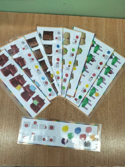 Материал: набор карточек: основное поле с одной стороны изображены схемы предлогов (НА, В, ЗА, ПЕРЕД, ПОД, МЕЖДУ, ОКОЛО, НАД) с другой цветные кляксы; два набора рабочих карточек 1-с картинками соответствующие схемам, под каждой картинкой изображена подсказка (схема предлога и цвет предмета о котором идет речь), 2- карточки те же только без подсказок.