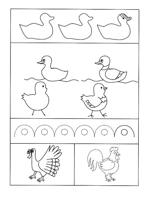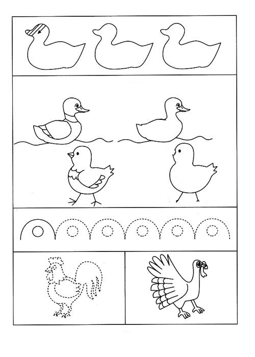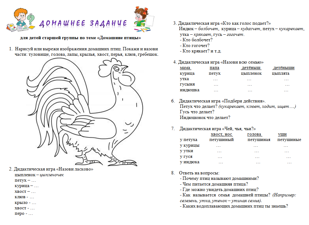 1. Побеседуйте с ребенком о птицах. Напомните, что птицы – это животные, чьё тело покрыто перьями. У них есть туловище, шея, хвост, голова, на которой расположен клюв. Детёныши птиц называются – птенцы и они появляются из яиц, которые откладывает птица. Есть птицы дикие, которые живут сами по себе, а есть птицы домашние, которых человек заводит специально. Человек за ними ухаживает, а птицы приносят ему пользу. 2. Рассмотрите с ребёнком иллюстрации с изображением домашних птиц и их семей. Закрепляйте в речи ребёнка названия домашних птиц. Повторите названия птиц и их детёнышей. Ребёнок в старшем дошкольном возрасте уже знает названия всех представителей «семьи» птицы.
