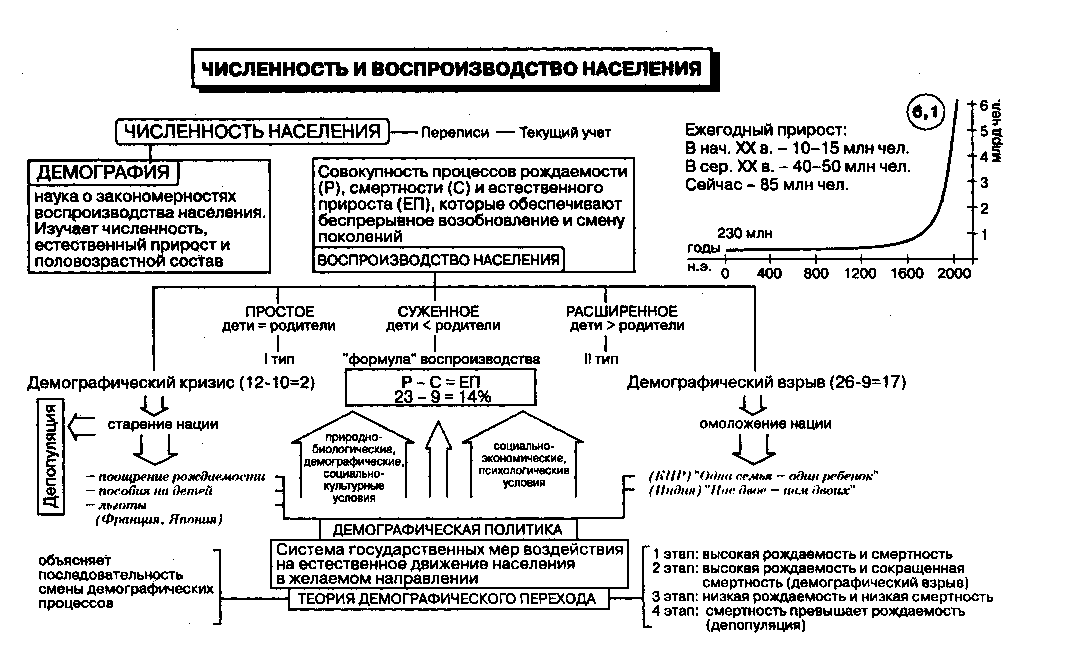 Часто при объяснении нового материала во всех классах совместно с детьми составляем логические опорные схемы для более полного запоминания учебного материала. Так, при изучении темы «Численность и воспроизводство населения» в 10 классе ЛОС получается таким: