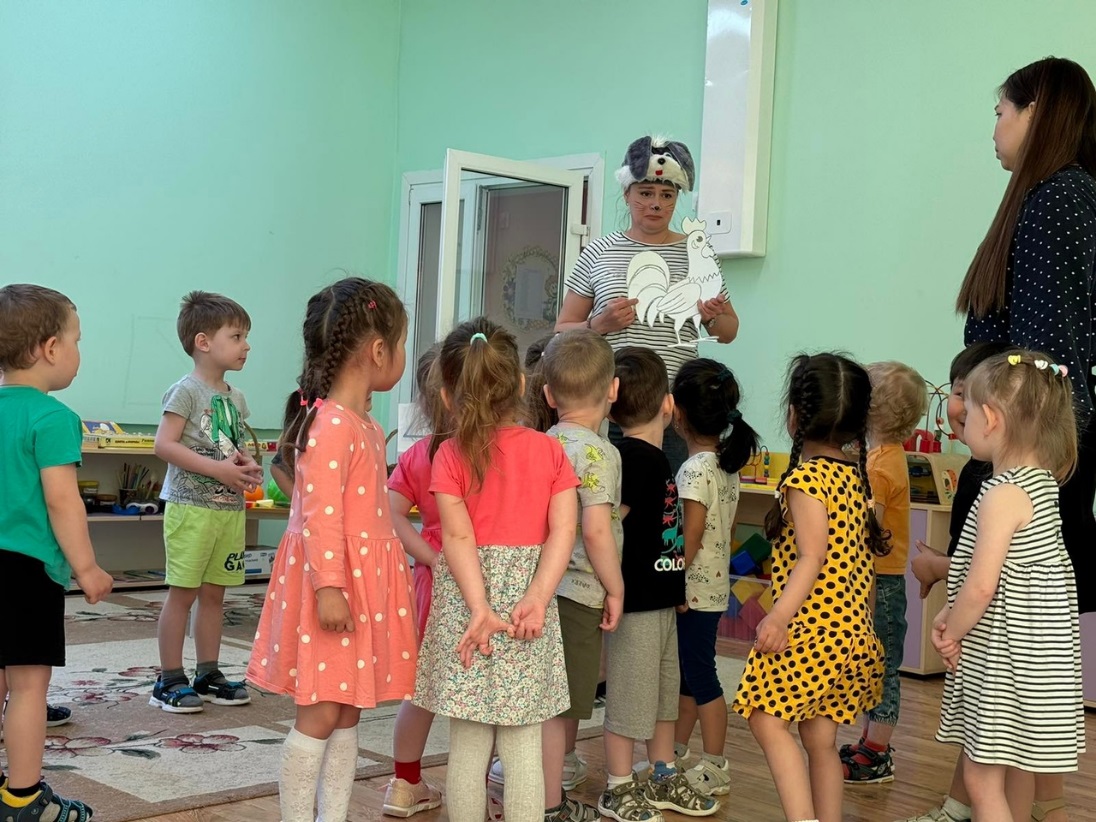 Воспитатель: Тогда отправляемся в дорогу!Петушок, ты оставайся дома, а мы с ребятами пойдем искать твои краски.