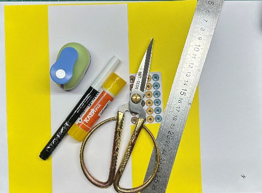 | Ножницы, простой карандаш, фигурный дырокол, линейка, черный маркер, клей - карандаш |