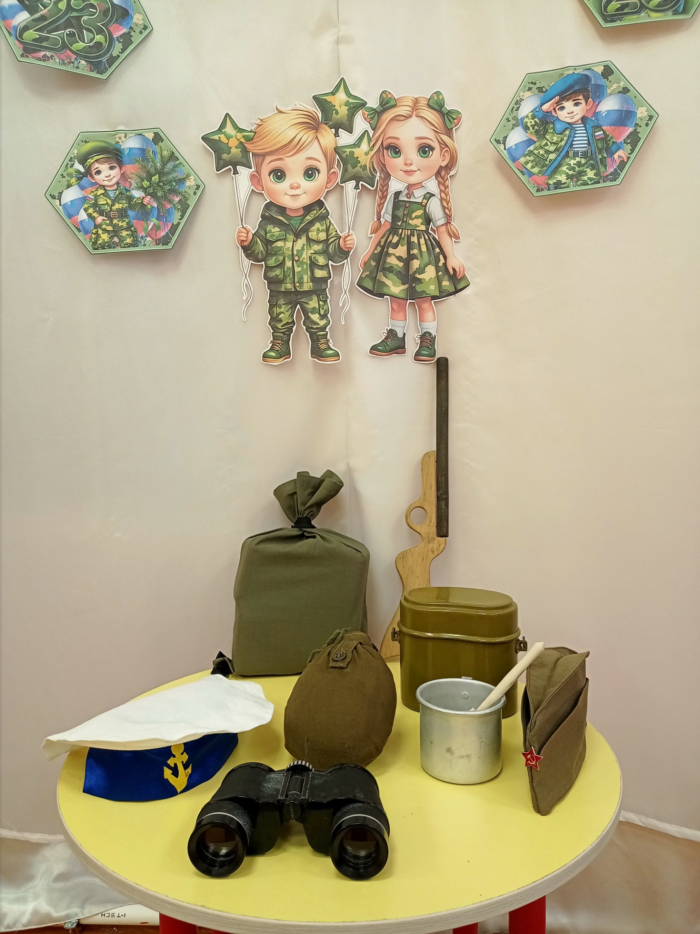 В корзинках лежат предметы которые нужны для военных ( бинокль, вещь- мешок, фляжка, кружка, пилотка, ложки , котелок) и предметы которые нужны в обычной жизни(игрушки, книжки, кубики и п.р.) Детям нужно взять предмет который пригодится солдату и перенести в другую корзинку.