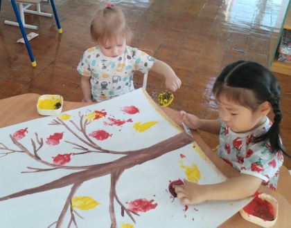 Воспитатель: Верно на деревьях. И сегодня я предлагаю сделать картину в память об осени. Сегодня мы с вами сделаем большую картину, которую назовем «Красивые листочки».