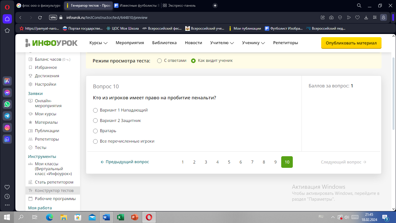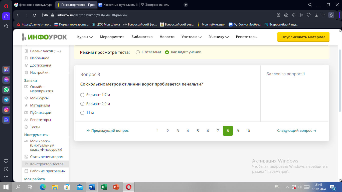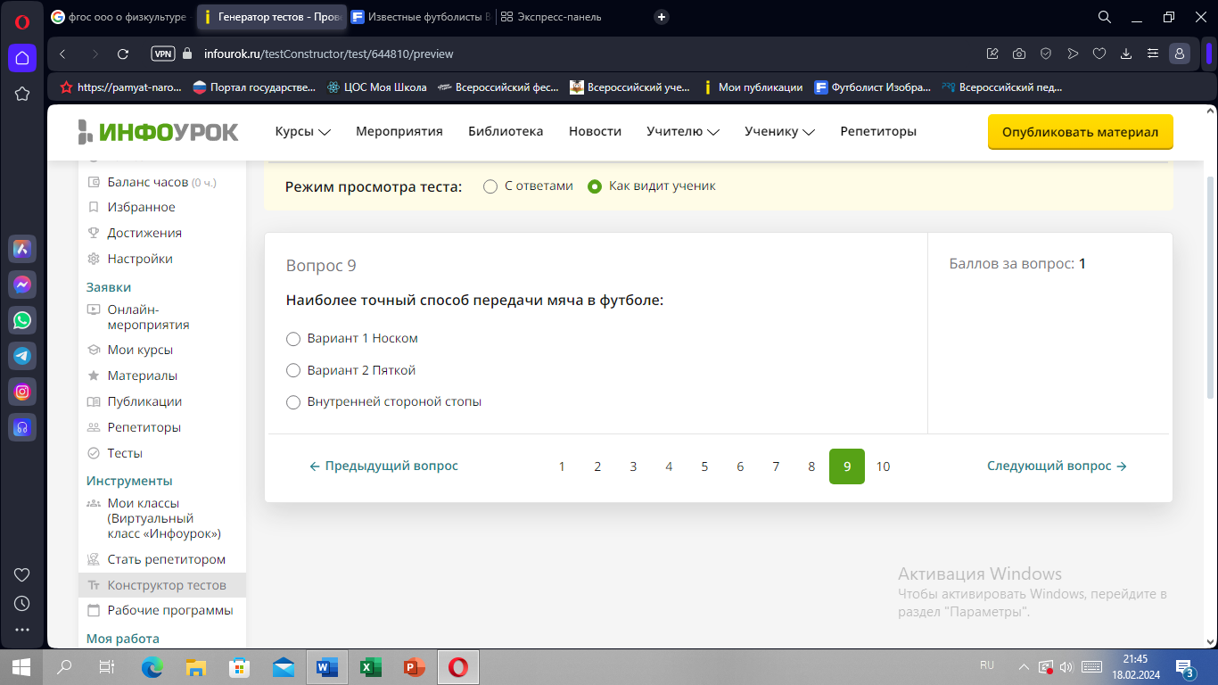1. Манишки разных цветов. 2. Конусы. 3. Фишки. 4. Кегли. 5. Гимнастические маты. 6. Гимнастические палки. 7. Обручи. 8. Мячи теннисные, волейбольные, футзальные. 9. Скакалки. 10. Гимнастические скамейки. 11. Секундомер.