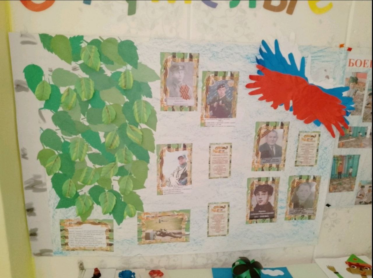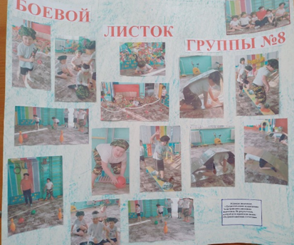 В нашей группе «Дельфинчики» большое место отводим нравственно-патриотическому воспитанию. Стало доброй традицией делать стенгазеты. Так к 23 февраля дети совместно с воспитателем выпустили следующие стенгазеты: «Наши защитники отечества» и «Боевой листок группы №8». В этих стенгазетах была отражена, если так можно сказать история нашей страны: сами дети (которым было присвоено звание «будущий защитник отечества»), папы детей и прадеды.
