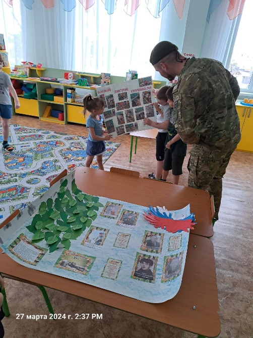 В группе неоднократно проводились акции: «Письмо солдату», «Собери посылку для солдата». Дети с удовольствием рисуют рисунки и делают творческие работы для наших ребят, которым выпала нелегкая задача защищать нашу Родину. Было очень приятно получить видио письмо с благодарностью от наших защитников. Так же отправляли видио письмо папе одного из воспитанников, который, к большому сожалению, получил ранение и находится в госпитале. Последняя акция была 27.03.2024г. Дети не только принесли продукты, вещи, мыло и т.д. , но и сделали поделку. В гости к детям пришел участник СВО с позывным «Легион», дети наперебой рассказывали свои новости. Показали наш «Боевой листок группы №8» и стенгазету «Наши защитники отечества», рассказали и показали своих пап и прадедов. Отдали посылку и свои поделки для солдат. Наш гость, совсем не долго побыл с нами, он ушел, а дети долго не могли угомониться, наперебой рассказывали друг другу, какой солдат большой, сильный и сколько много у него наград. Собранную нами посылку военнослужащий с позывным «Легион» совсем скоро доставит на передовую.