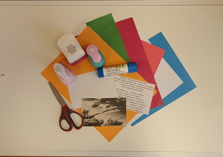 Для обучающихся: Компьютер (ноутбук) с выходом в сеть Интернет, схемы пошагового выполнения работы, цветная бумага (синяя, красная, белая, розовая, зеленая, оранжевая), плотный картон (белый), дыроколы фигурные (цветок широкий, цветок узкий, звезда), клей-карандаш, ножницы, шаблон Георгиевская лента, тематическая фотография. стихи.