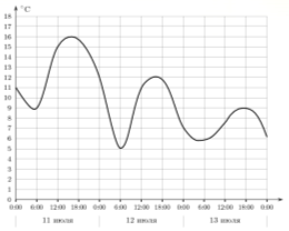 Задача. На графике показано изменение температуры воздуха на протяжении трех суток, начиная с 0 часов 11 июля. На оси абсцисс отмечается время суток, на оси ординат — значение температуры в градусах. Определите по графику, до какой наибольшей температуры прогрелся воздух 13 июля. Ответ дайте в градусах Цельсия.