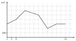 Задача. На графике, изображенном на рисунке, представлено изменение биржевой стоимости акций нефтедобывающей компании в первые две недели сентября. 3 сентября бизнесмен приобрел 10 акций этой компании. Шесть из них он продал 10 сентября, а 12 сентября продал остальные 4. Сколько рублей потерял бизнесмен в результате этих операций?