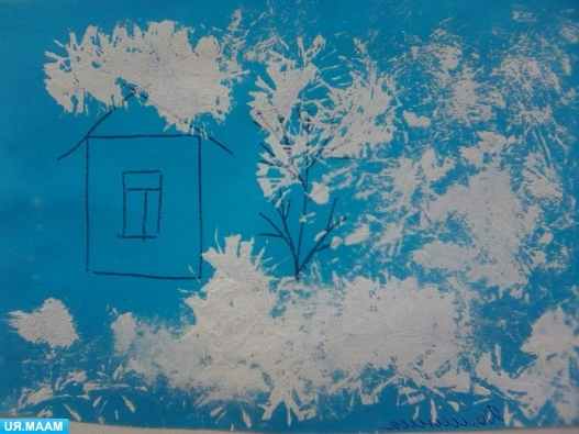 -Совершенно верно, на нем незаконченный зимний пейзаж. (без снега, и я вам предлагаю нарисовать, как снежок раскрасил все в белый цвет. (Показываю техника рисования тычком кисточки по - сухому (без намачивания кисточки в воде)