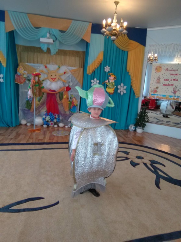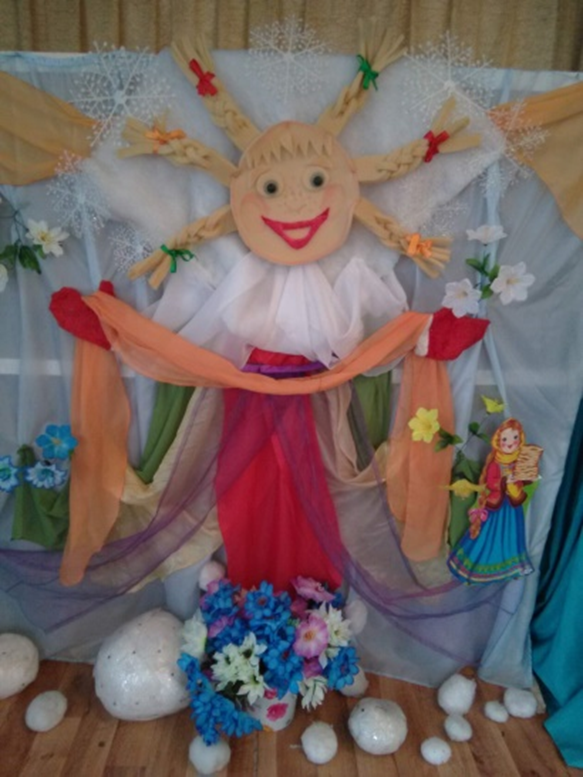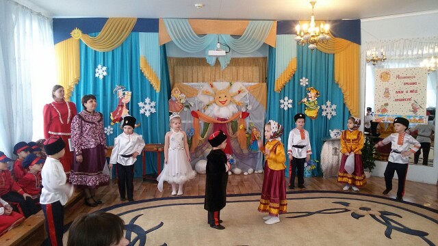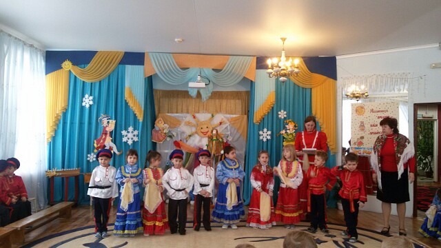 развешаны плакаты с названиями дней недели Масленицы, русские платки, народные инструменты (ложки, колокольчики, трещотки, треугольник, бубен, барабан) самовар, скатерть ,стопа блинов, театр «Масленица»(театр «Люди-куклы»), лошадка, платочки, вуали, макеты птиц.В оформлении используем изделия донских казачьих промыслов, самовар.