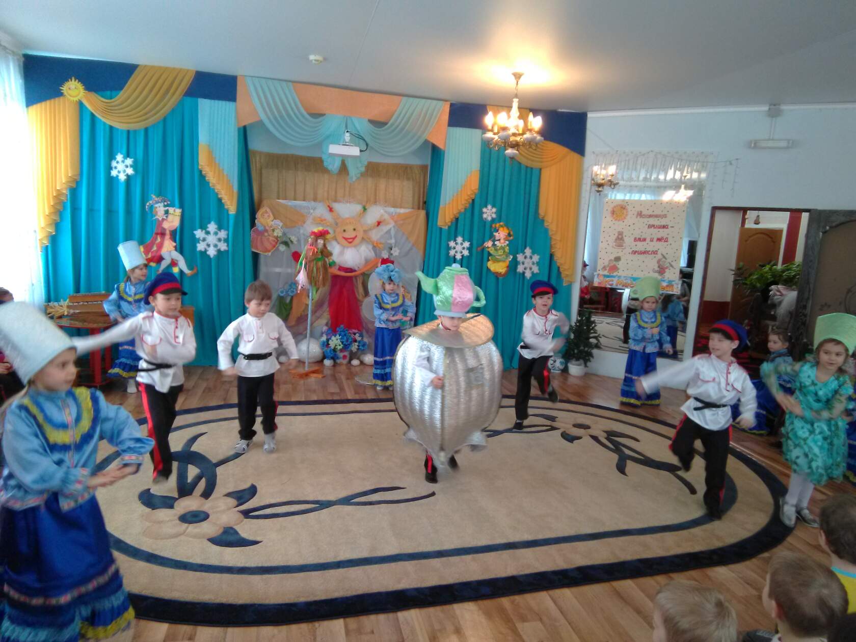 Дети собираются в зале, в котором всё уже приготовлено для встречи Масленицы: накрыт стол с угощением, подготовлено место для игр.