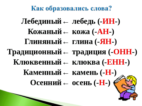 Определим, при помощи каких морфем образованы имена прилагательные и от каких слов. (Слайд)