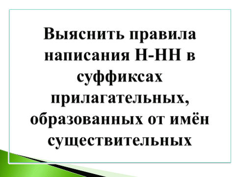 Образовательная: Объяснить правописание Н-НН в суффиксах имён прилагательных, образованных от имён существительных.