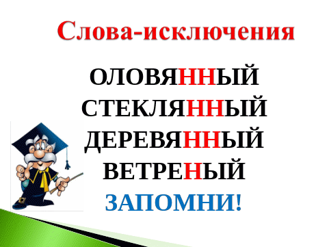 Правильно! Ребята, это очень упрямые слова, они не хотят подчиняться правилу. Это слова – исключения. Давайте их запомним и запишем в наши дневники научных открытий ( запись в тетради слов-исключений.) Оловянный (искл), Стеклянный (искл.) деревянный (искл), ветреный(искл) Но Безветренный
