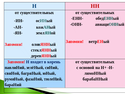НН пишется в словах с суффиксами ОНН, ЕНН и в словах с основой на Н