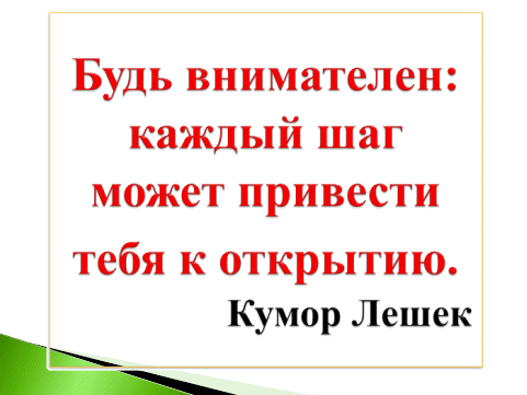 Открытия делать, несомненно, очень трудно. Для этого нужно много и старательно трудиться. Часто, чтобы сделать даже небольшое открытие, человек должен учиться и работать много лет. Только терпеливые и старательные люди смогут добиться успехов. А пока я желаю вам удачного дня и хочу, чтоб девизом вашего сегодняшнего дня стали слова Кумора Лешека: «Будь внимателен: каждый шаг может привести тебя к открытию» (Презентация - слайд )