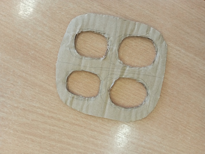 Из упаковочного картона вырезаем стенки домика -пенька. Прорезаем проем двери и окно. Отдельно вырезаем раму.