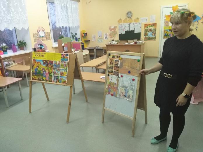 Оборудование:Мольберт на котором прикреплены сюжетные картинки по теме «Осень, осенний лес».
