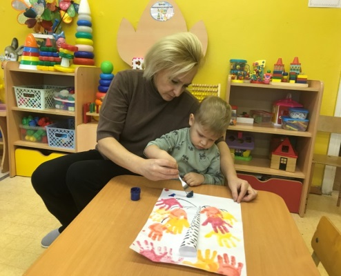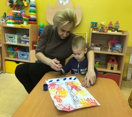 Воспитатель: Ребята, кто знает какого цвета листочки? (ответы детей) Посмотрите какие они красивые. Мы сегодня с вами будем волшебниками, мы будем рисовать не кисточками, а ладошками. У вас на столах лежит лист, на котором только ствол и ветки дерева. А чего не хватает этому дереву? (ответы детей). Правильно! Не хватает осенних листочков. И рисовать мы будем яркие осенние листочки на дереве и на земле. Смотрите внимательно, как мы будем рисовать осенние листочки. Свою ладошку я обмакиваю в краску и делаю отпечаток на веточку дерева. И так много, много мы нарисуем разноцветных листьев.