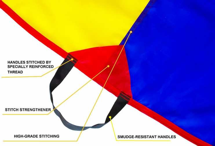 Детский игровой парашют представляет собой круг диаметром от 2,5 до 3,5 метров, состоящий из 8–14 разноцветных секторов. По длине окружности парашюта пришиты петли, за которые держатся игроки. Игровой парашют сшит из качественной, яркой, воздухопроницаемой ткани. Все швы прострочены армированными нитками для придания дополнительной прочности изделию.