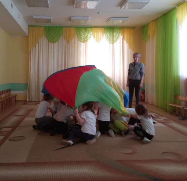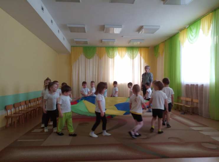 Все игры с парашютом мы разделили на группы. Это игры с бегом вокруг парашюта, игры с участием взрослых, игры с применением мышц плеча и предплечья в движении вверх и вниз, игры с движением под парашютом (проходы под ним), игры – прятки под парашютом