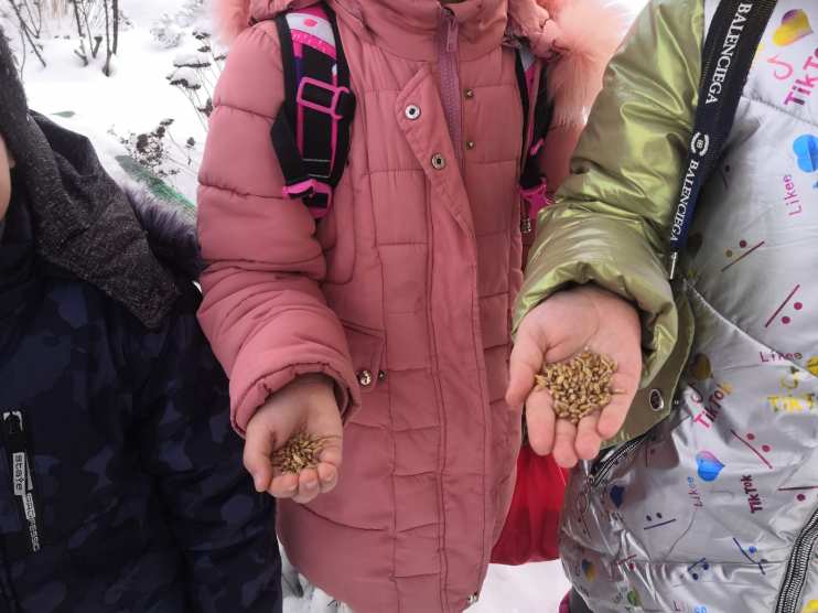 В конце классного часа мы с ребятами вышли в школьный двор и насыпали корм в кормушки.