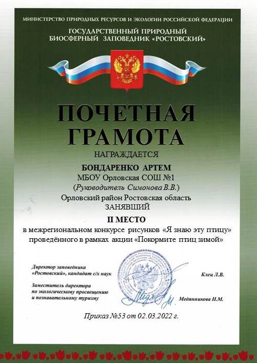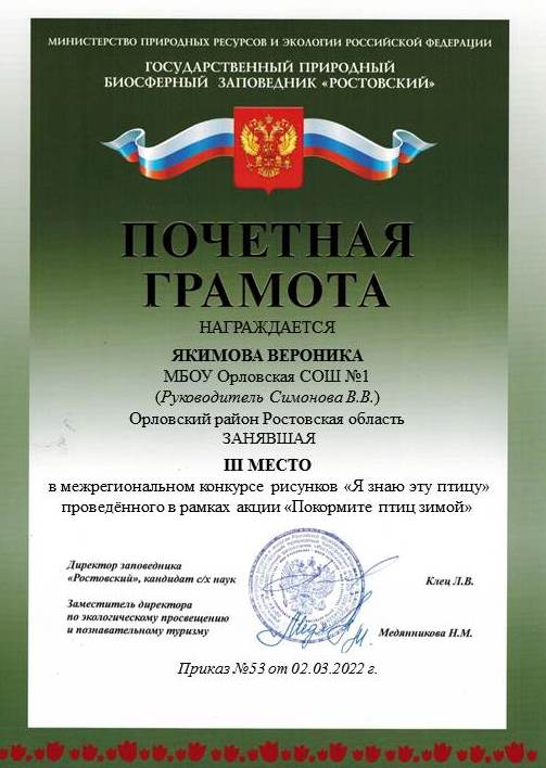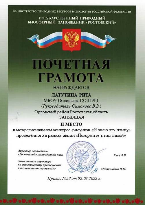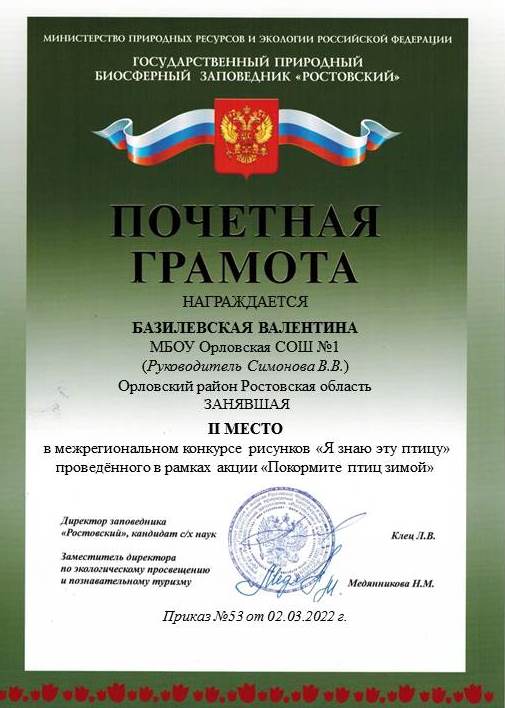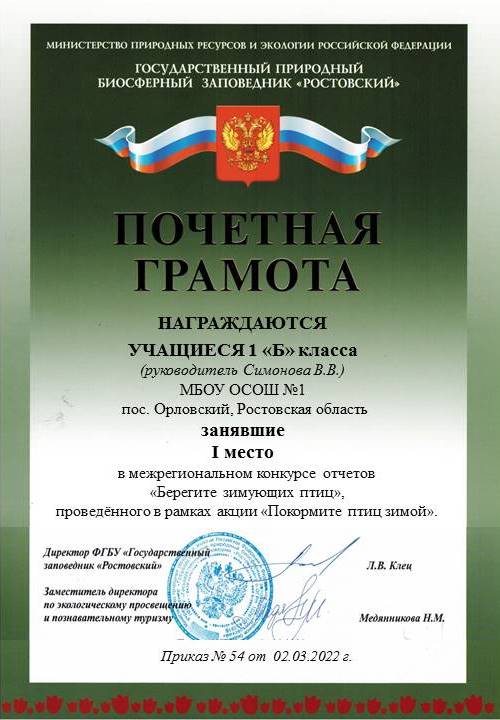 Нам с ребятами очень приятно, что в межрегиональном конкурсе отчетов «Берегите зимующих птиц» мы заняли 1 место.