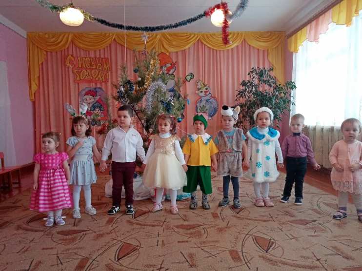 ВЕДУЩАЯ: Ребята, почему-то елочка наша загрустила и огоньками не горит. Давайте все вместе скажем: 1, 2, 3, наша елочка, гори! (Дети говорят, елка загорается) Ну вот, теперь порядок, можно дальше елочке стихи читать.