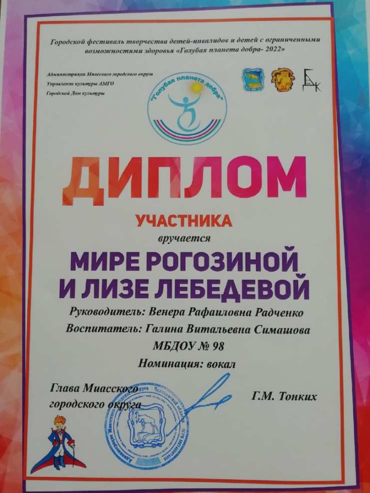 Мои воспитанницы Рогозина Мира и Лебедева Лиза посещают логопедическую группу в детском саду. Наши девочки тоже приняли участие — они спели песню «Пришла весна». Девочки пели первый раз на большой сцене, и, думаю, выступили достойно, ведь им всего 4 года. И участники, и зрители получили массу приятных впечатлений и эмоций.