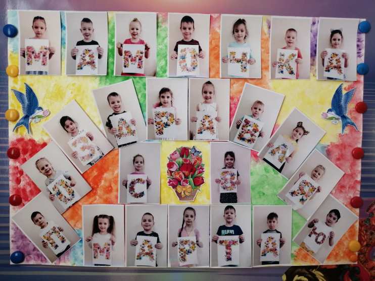 Дети с удовольствием делились рассказами о своих мамах и бабушках, принимали активное участие в изготовлении стенгазеты. Каждого ребёнка сфотографировали в определённом порядке, распечатали на фотобумаге и разместили фото на стенгазету, чтобы получилась надпись.