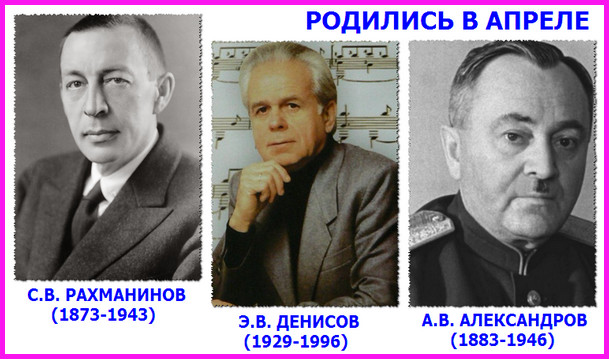 1 апреля 1873 года в Новгородской губернии родился Сергей Рахманинов, ставший впоследствии гениальным пианистом и композитором. Кажется, сама природа помогла ему стать фантастическим исполнителем: пальцы музыканта были такой длины, что спокойно охватывали расстояние в 12 белых клавиш. Несмотря на то, что многие годы Рахманинов провел в Европе и США, он всегда считал себя русским. Все его произведения пронизаны образами любимой Родины, мощной удалью, необъятными просторами полей, буйством красок. Его 2-й фортепианный концерт стал символом новой эпохи, с ее взрывчатой энергией и бурными переменами. 6 апреля 1929 года – день рождения Эдисона Денисова – композитора, который считал, что музыка и математика переплетаются теснейшим образом. Он получил два полярно противоположных высших образования: окончил физико-математический факультет Томского университета и Московскую консерваторию. Композитор решительно отвергал все типовые, модные или проверенные временем направления в музыке. Он считал, что в искусстве нужно изобретать новую красоту, потому что классику повторить невозможно. Денисов постоянно экспериментирует, и в результате создает такие шедевры, как Симфония для большого оркестра, балет «Исповедь», «Реквием».