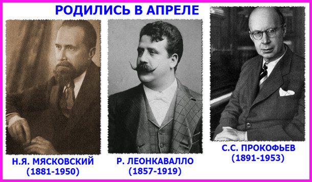23 апреля 1857 года появился на свет Руджеро Леонкавалло – автор знаменитой оперы «Паяцы». Внук известного неаполитанского художника, он тоже связал свою жизнь с искусством. В юности он был больше известен как талантливый пианист-аккомпаниатор, и только в более зрелом возрасте предъявил миру талант композитора. Несмотря на удачную постановку «Сельской чести», триумф композитору принесла именно премьера оперы «Паяцы». Немаловажную роль сыграло и то, что исполнителем главной роли в ней был Энрике Карузо, а дирижировал оркестром Артуро Тосканини. К сожалению, превзойти успех «Паяцев» Леонкавалло не смог и остался в числе композиторов – авторов одного шедевра. В этот же день, но почни на полвека позже, 23 апреля 1891 года, в станице Сонцовка родился мальчик, которого, по невероятному совпадению, за его светлый жизнерадостный характер называли «солнечным» ребенком – Сергей Прокофьев. Он рано начал заниматься музыкой и сочинять. Все его опусы старательно записывала мать, поэтому к 10 годам юный композитор уже имел богатое творческое наследие, в том числе и 2 оперы. В 13-летнем возрасте Прокофьев был зачислен в Петербургскую консерваторию, которую блестяще окончил сразу по трем направлениям: как исполнитель на органе, фортепиано, и как композитор. Его произведения могли нравиться или нет, они подвергались похвалам или критике, но не оставляли равнодушным никого из слушателей.