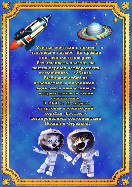 - иллюстрации «Земля из космоса», «Звёздное небо», портреты космонавтов, «Ощущение невесомости»;