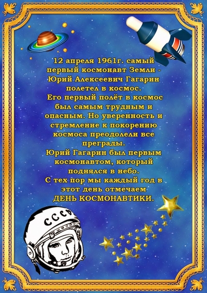 История России богата героическим прошлым, которым можно и нужно гордиться всем поколениям россиян. Дети дошкольного возраста способны воспринимать наиболее значительные события истории Отечества, знать её героев. Дети должны знать историю российского праздника – День космонавтики; дату первого полёта в космос; о первом космонавте Юрии Алексеевиче Гагарине; о героических покорителях космических просторов.