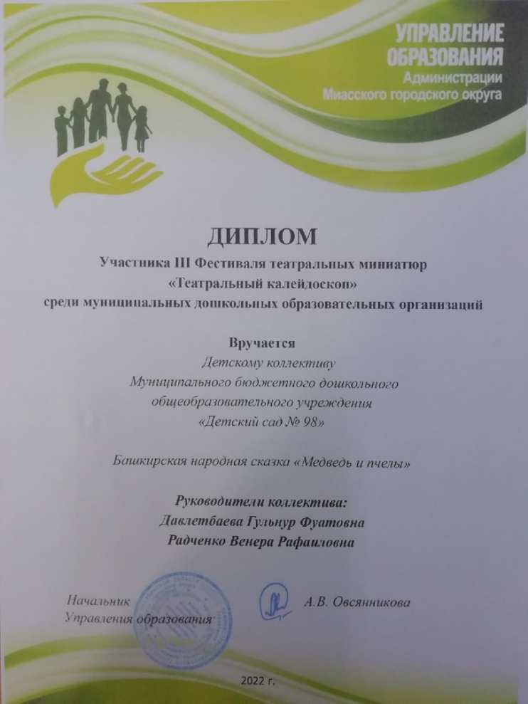 Наши ребята из средней группы «Сказка» совместно приняли активное участие в III муниципальном фестивале театральных миниатюр «Театральный калейдоскоп» среди муниципальных дошкольных образовательных организаций города Миасс с башкирской народной сказкой «Медведь и пчелы».