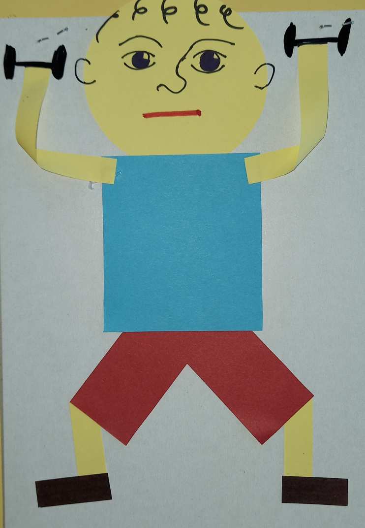 Вырезав все фигуры, представленные в презентации, нужно склеить таким образом, чтобы по итогу получился человечек, который делает зарядку.