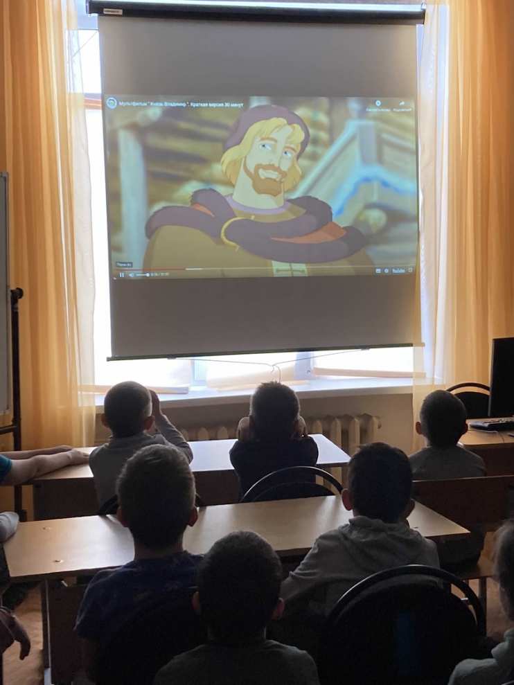 Изучая историю создания России, её становления и развития, ребята просмотрели фильм «Князь Владимир». Мультфильм-сказка воссоздает эпоху князя Владимира Красное Солнышко, рассказывает историю его прихода к власти, столкновений с печенегами и связи с Византией. В нем красочно показана невиданная и загадочная древняя Русь, утопающая в красках первозданной природы и старинных праздников. Деревянные города и необъятные просторы, жестокие сражения и щедрые пиры, шумные ярмарки и грандиозные охоты. На фоне всех этих исторических событий и удивительных приключений формируются чувства гражданственности и патриотизма, долга, ответственности, настоящей дружбы, уважения к национальным ценностям народов России, бережного отношения к родному краю, любви к Родине.