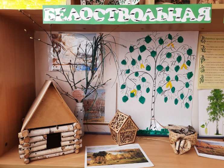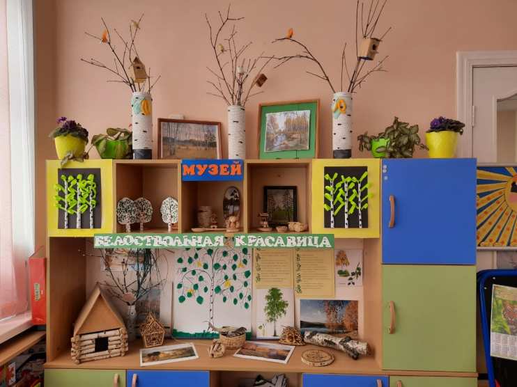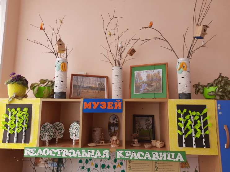 В нашей группе (средней логопедической) мы решили создать мини-музей "Белоствольная красавица". Собрали картотеку: стихотворения, пословицы, поговорки, народные приметы про берёзы. Сделали подборку репродукций картин русских художников. Родители оказали помощь в сборе коллекции изделий из дерева и бересты. Дети выучили стихотворения и песни, выполняли роль экскурсоводов и рассказывали про символ России детям из соседних групп.