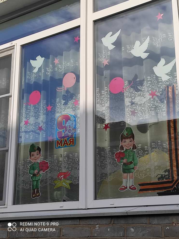 Мы перед праздником Победы много беседовали с детьми, рассказывали в доступной для них форме о Великой Отечественной войне, читали рассказы и стихи, смотрели мультфильмы и презентации, рисовали, оформили праздничное окно "Пусть всегда будет мир!". Родители приняли активное участие в нашей работе.