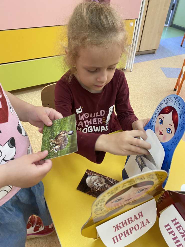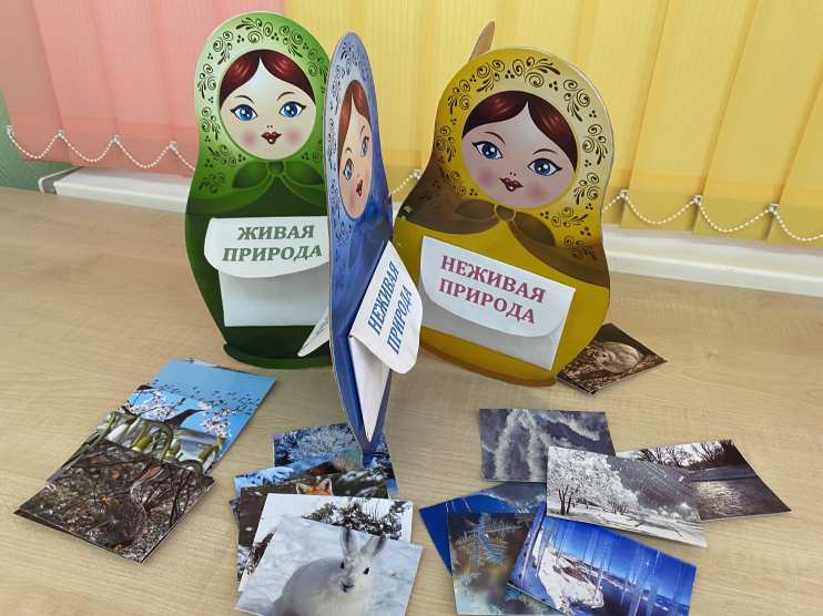 На каждой стороне матрёшки расположены конверты с картинками «живая» и «неживая природа», которые нужно распределить по нужным кармашкам.